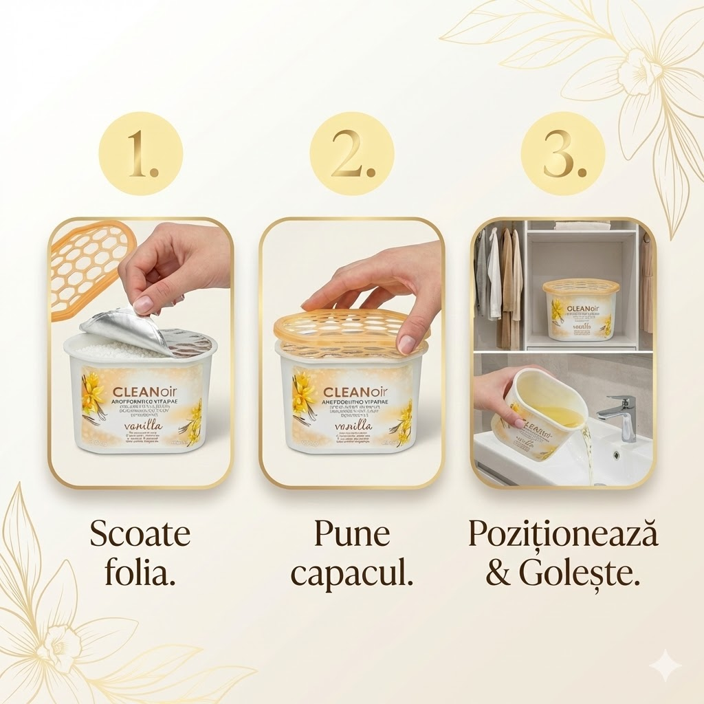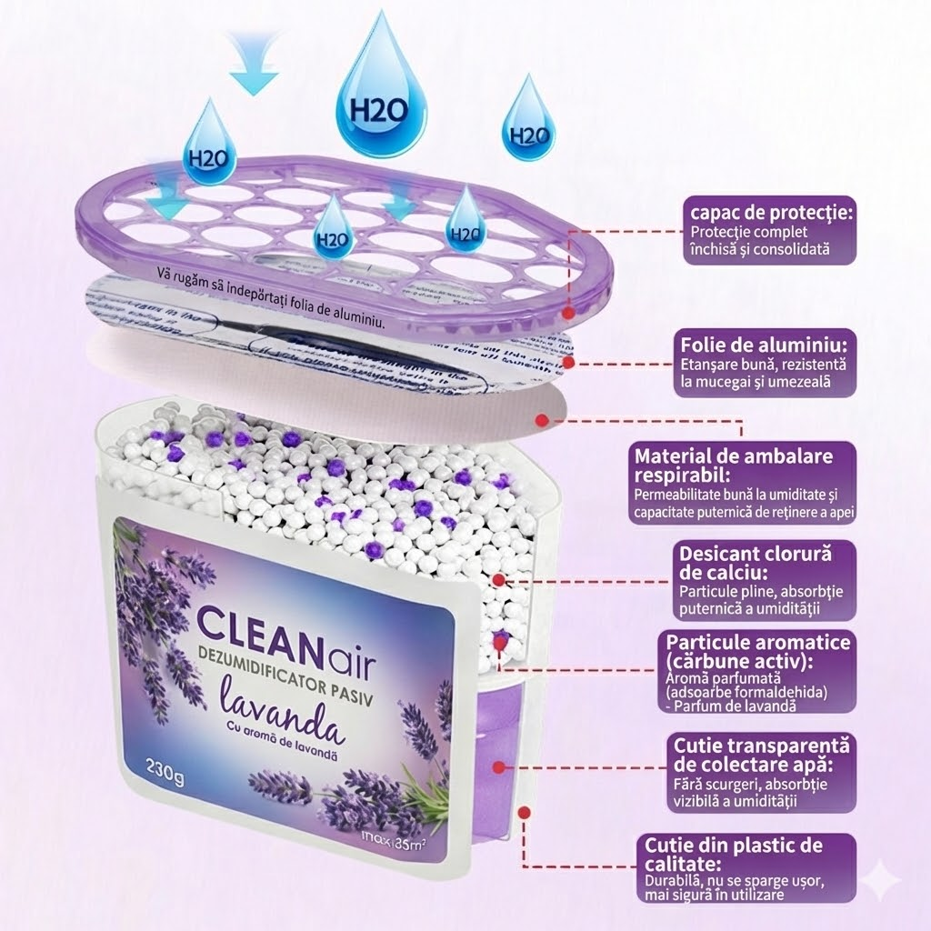 Atenție: Doar pentru utilizare în spații interioare (dulapuri, camere, băi) în scopul absorbției umidității. Nu ingerați conținutul (granule sau lichidul colectat) și nu utilizați produsul în alte scopuri decât cele indicate. ▪ Evitați contactul: Lichidul colectat și granulele pot fi iritante. Evitați contactul cu pielea, ochii, hainele, mobila sau suprafețele metalice. În caz de contact accidental cu pielea sau ochii, clătiți imediat zona cu multă apă. Curățați imediat scurgerile de lichid cu apă călduță. ▪ Poziționare: Asigurați-vă că recipientul este așezat pe o suprafață plană și stabilă pentru a evita răsturnarea accidentală a lichidului. ▪ A se ține departe de surse excesive de căldură. ▪ Siguranță: A nu se lăsa la îndemâna copiilor și a animalelor de companie. ▪ În caz de urgență: Dacă granulele sau lichidul sunt înghițite, solicitați imediat asistență medicală și prezentați eticheta ambalajului. ▪ Notă: Durata de utilizare și viteza de absorbție pot varia semnificativ în funcție de nivelul de umiditate, temperatura din încăpere și dimensiunea spațiului.